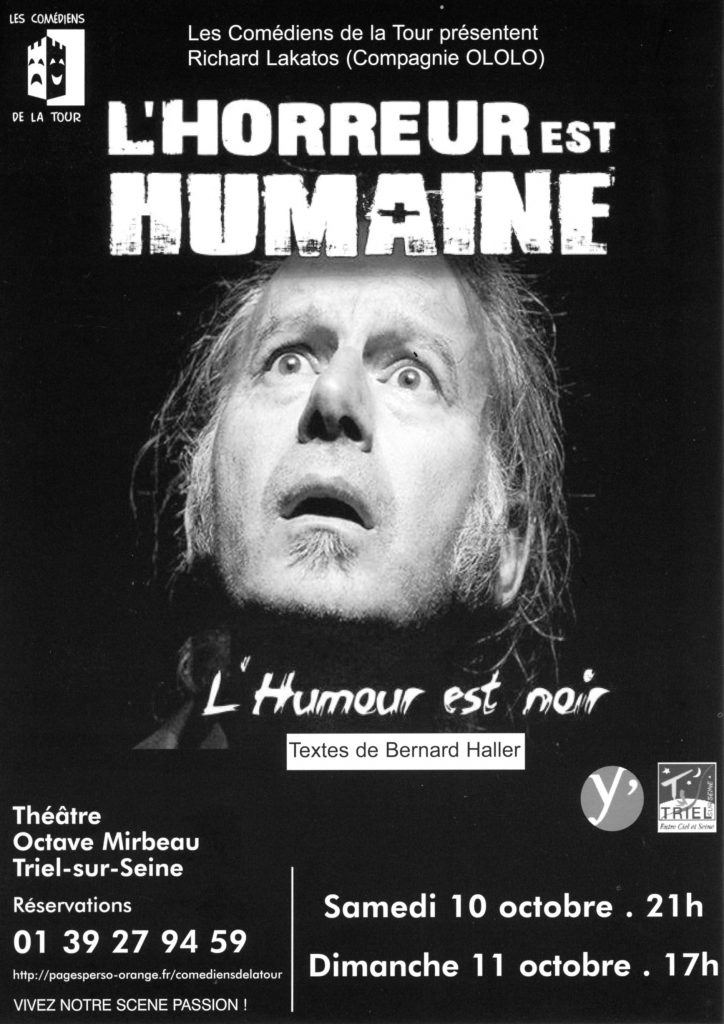 Seul en scène, Richard Lakatos nous offre avec son talent, sa personnalité et son sens de la scène, des œuvres de Bernard Haller telles que La Parade de l’horreur, Le Boulier, La Séance, Défense de poéter, Alléluia, Ascension politique. C’est de l’humour noir certes, mais on se délecte et l’on rit parfois de situations souvent cruelles. Richard, ancien comédien de la Tour et professeur à l’Ecole des Tréteaux, aujourd’hui comédien professionnel a composé son spectacle avec la complicité bienveillante de Bernard Haller qui hélas, nous a quittés en avril 2009.
